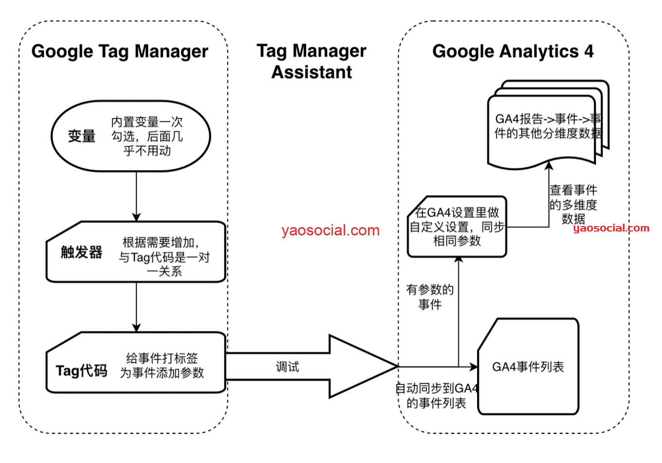 在整个设置设置的过程中,会涉及到GTM内部的设置,Tag Manager Assistant的使用,GA4的关联。三个工具的使用会让很多新手在接触的时候弄不清楚之间的关联关系。