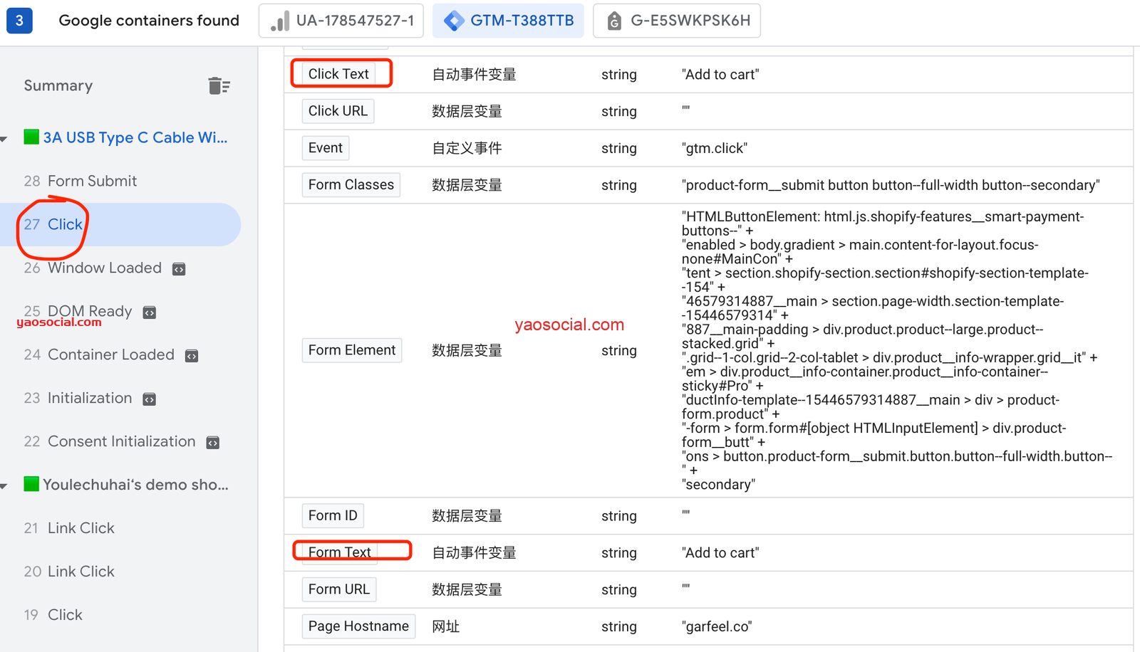 那就先去调试模式下的网站,点击产品后将产品加入购物车,就有了下图中22到28的路径。 加入购物车是一个点击行为,所以关注路径27,接着在右侧观察所有变量,看哪个变量最能代表这个事件。
