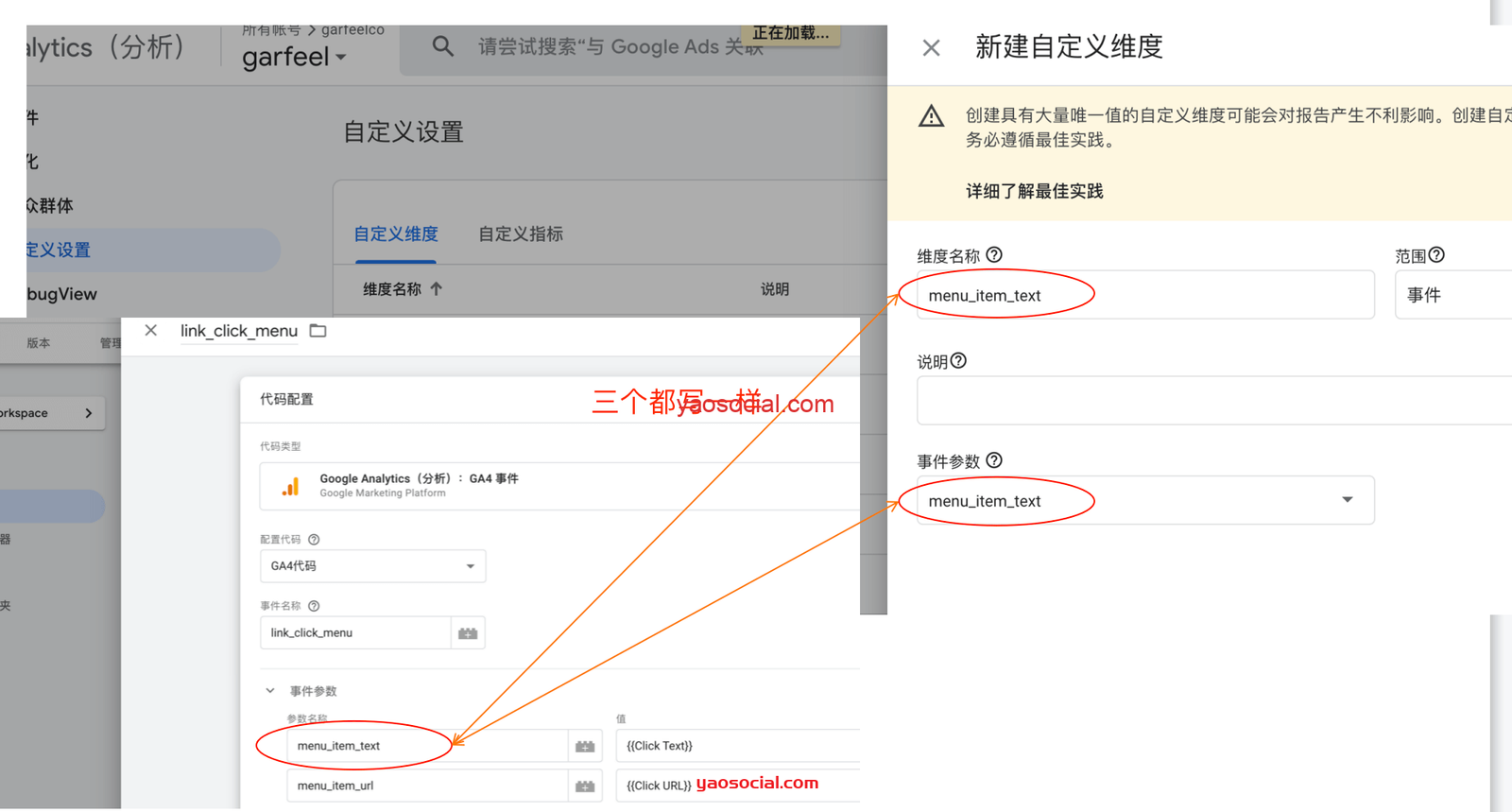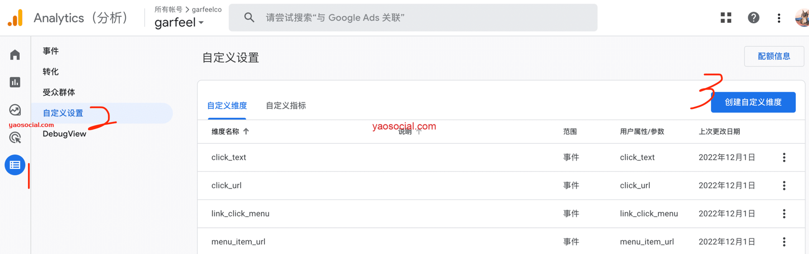 按照上述的截图,给Tag添加参数后,先不要关闭页面,马上去到GA4的配置页面,来创建自定义纬度。