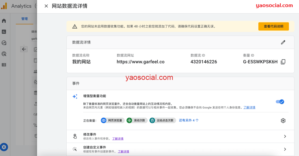 3)接着会弹出下面的界面,确认在“增强型衡量功能”中有我红框中圈出的这些内容,如果没有,就点击右侧圆圈地方的设置按钮,把它们打开。接着点击“创建数据流”。