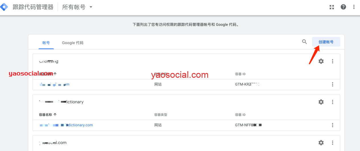 1)进入GTM后台,访问GTM的账户界面, 点击创建账号