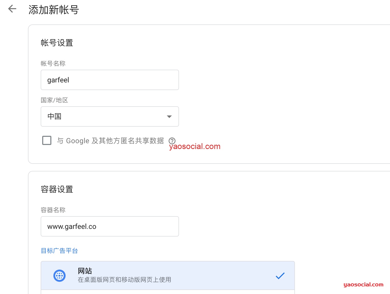2)按照如下所示,填写账户名字,容器名字,目标广告平台选择“网站”。然后保存