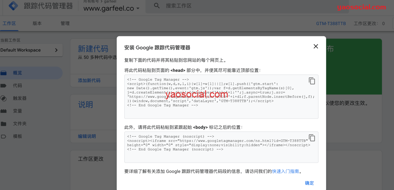 3)接下来,GTM就给你弹出一段代码,提示你添加。 看到代码后,就要开始进入到Shopify后台去添加代码了。