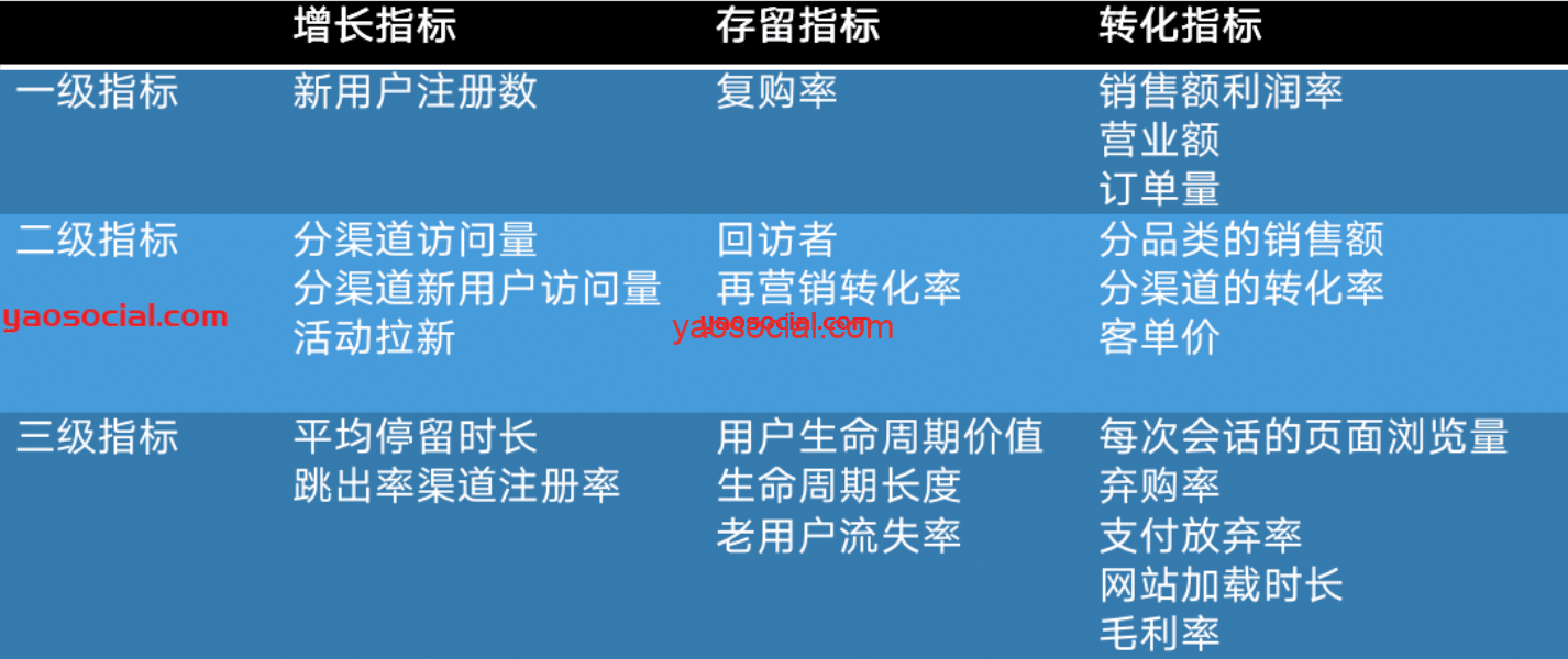 接着指标分级。公司级别指是老板最为关心的指标,也是受到管理层和执行层的双向理解和认同到执行决策级别的指标,比如订单量,订单金额;部门级别指标是指导部门工作的核心指标;而执行决策指标可能是数字也可能是事件。