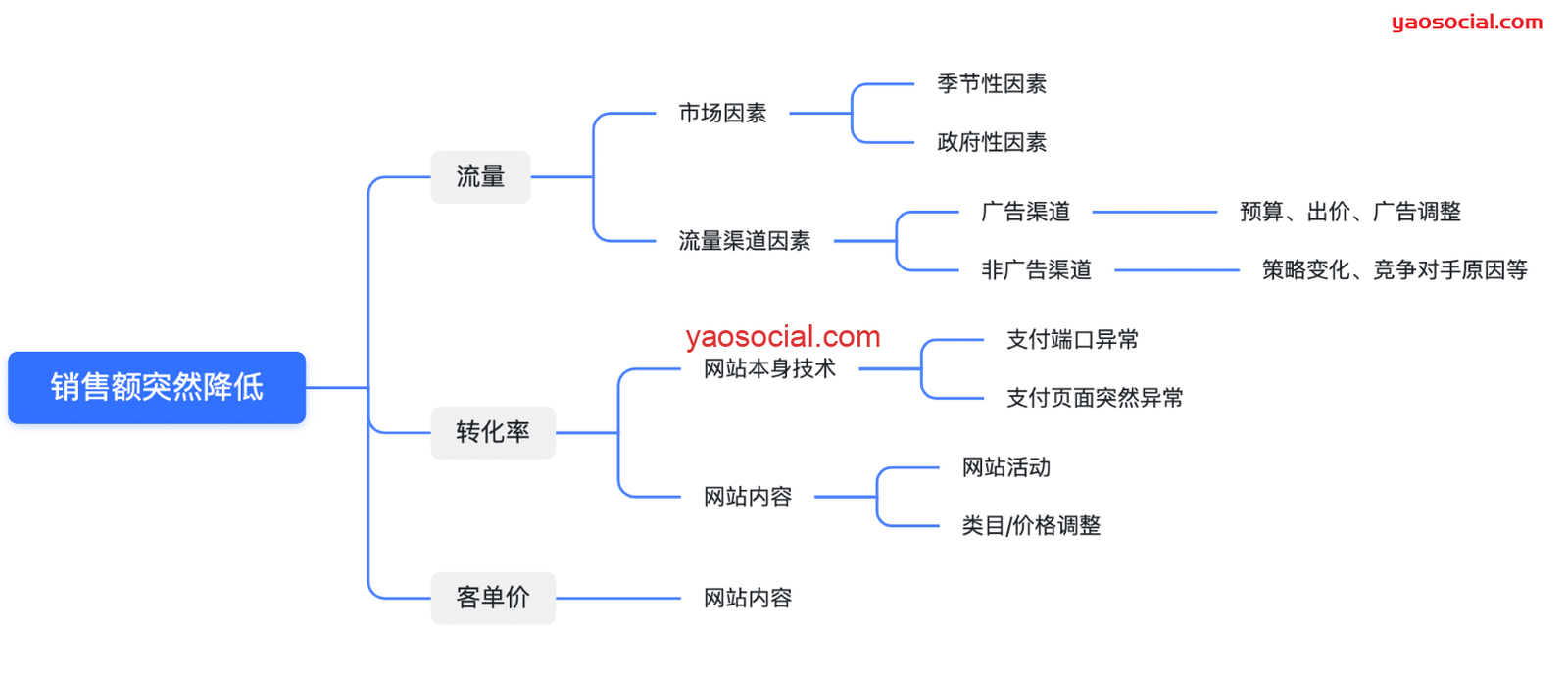 很多时候,销售额的下滑是来源于流量渠道的下滑,所以你可以根据网站实际渠道情况来列出更为详细的分支原因,这样就可以形成网站流量下滑的快速自检指导文档了。
