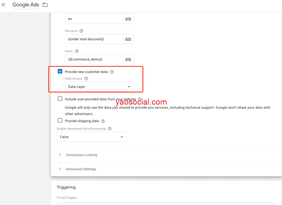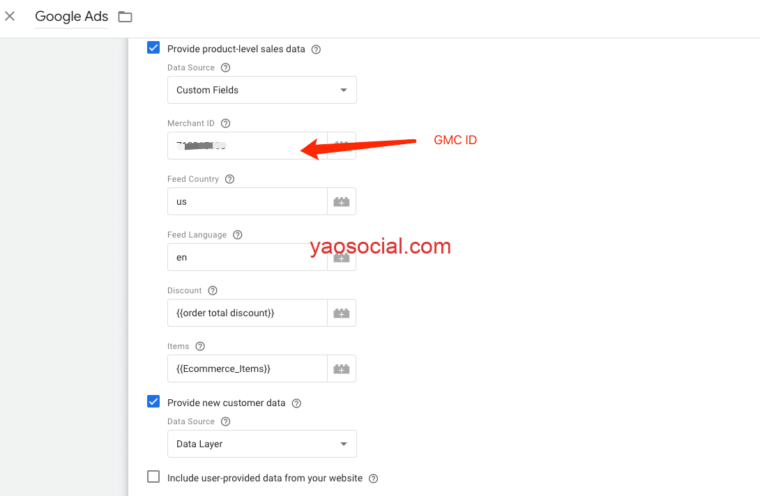 继续往下配置,勾选provide product-level sales data, 填写GMC ID, feed的目标国家和语言。Discount是本文第一步中创建好的变量,item是之前就配置好的变量。