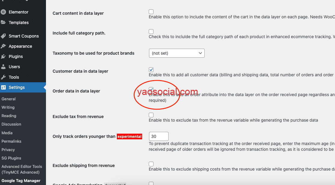 打开gtm4wp的插件的设置,点击integration-woocommerce,如下图所示勾选order data in data layer及 customer data in data layer。