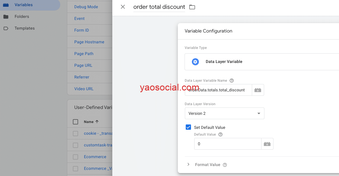 第二步: 进入Google Tag Manager创建一个自定义变量order total discount, 变量为 orderData.totals.total_discount,区分大小写的,一字不漏的复制过去。
