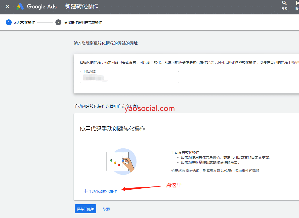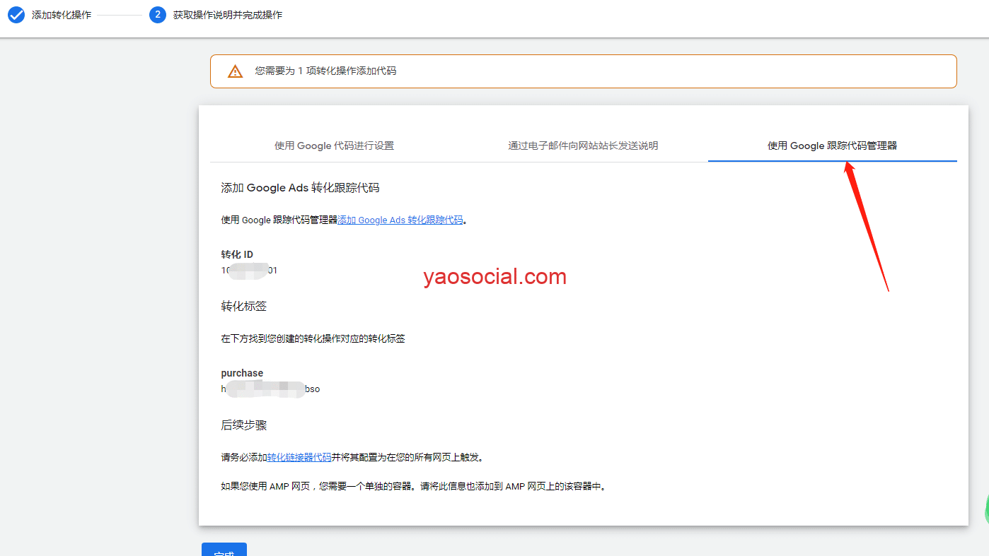 接着,在获取操作说明这里,选择“使用Google 跟踪代码管理器”。 这个页面不要关掉,待会儿会用到转化ID和转化标签。