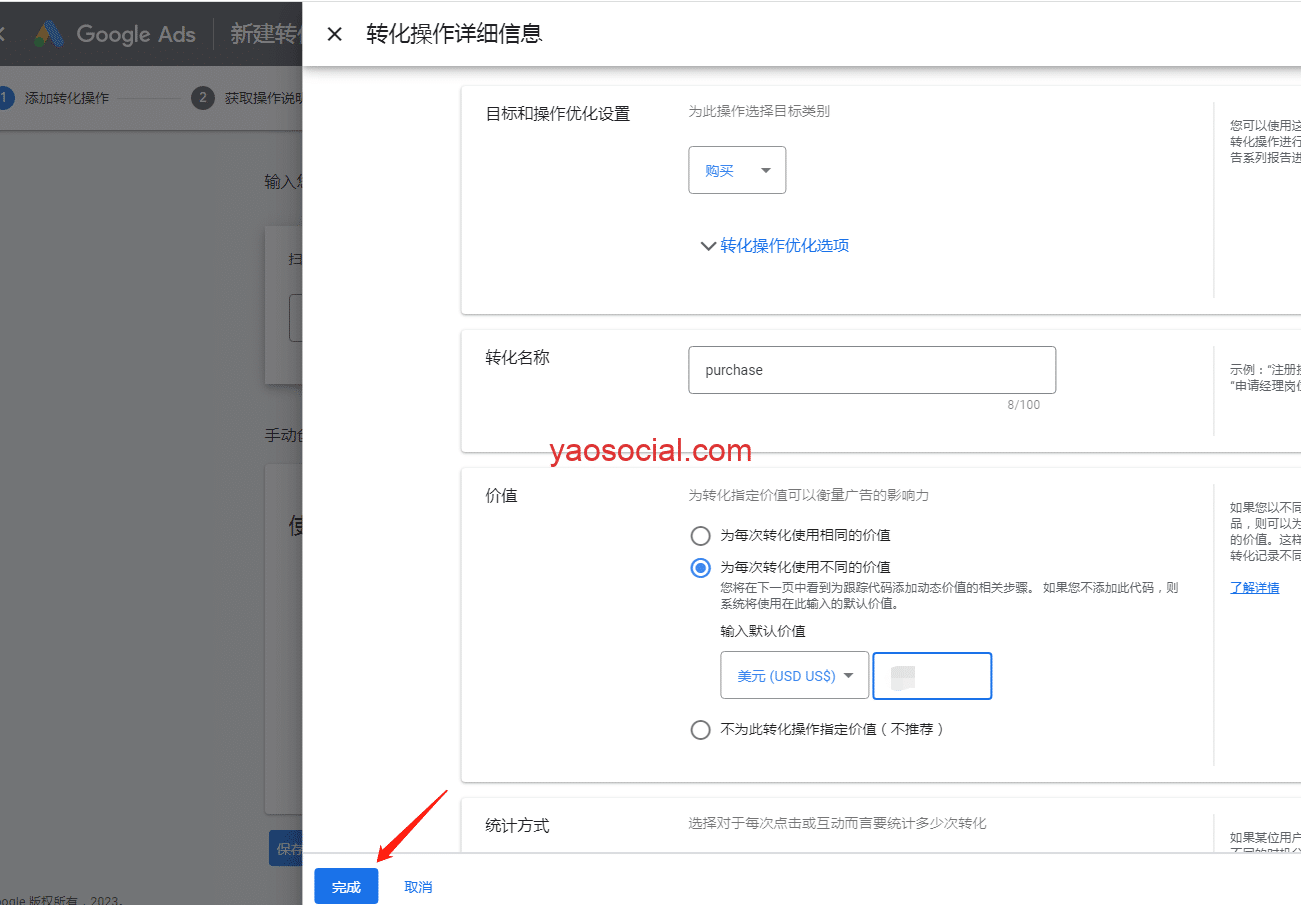 转化类别为购买,名称你可以写purchase,价值这里选择第二个选项,为每次转化使用不同的价值。点击完成