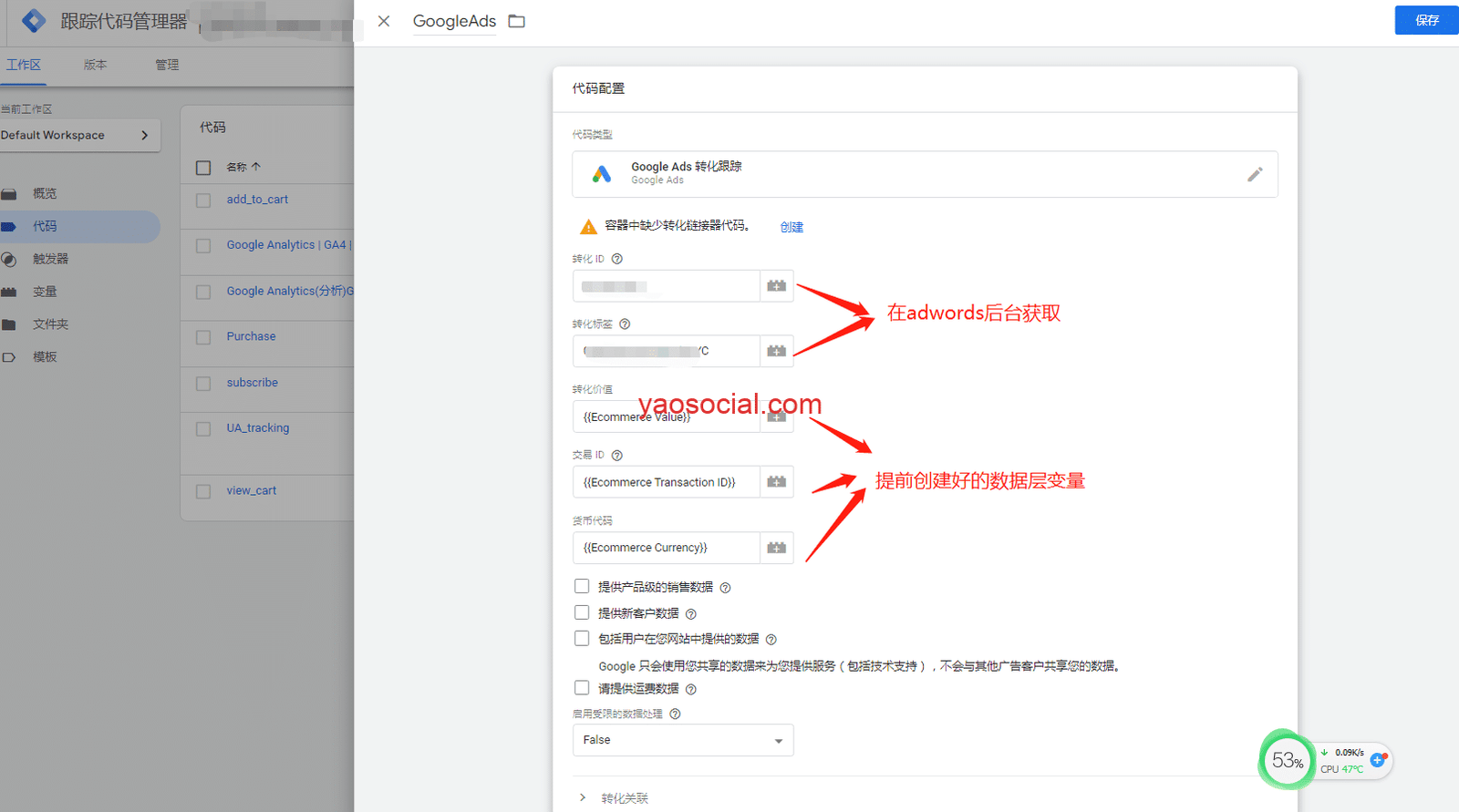 转化价值、交易ID及货币代码直接从变量里面选择。这些自定义变量是已经添加过了的。可参考之前的Woocommerce网站追踪购物次数及转化价值的教程。