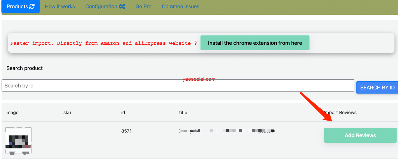 安装插件后,在插件页面你可以看到店铺里所有的产品,点击右侧的add reviews,输入亚马逊或速卖通链接就可以了。