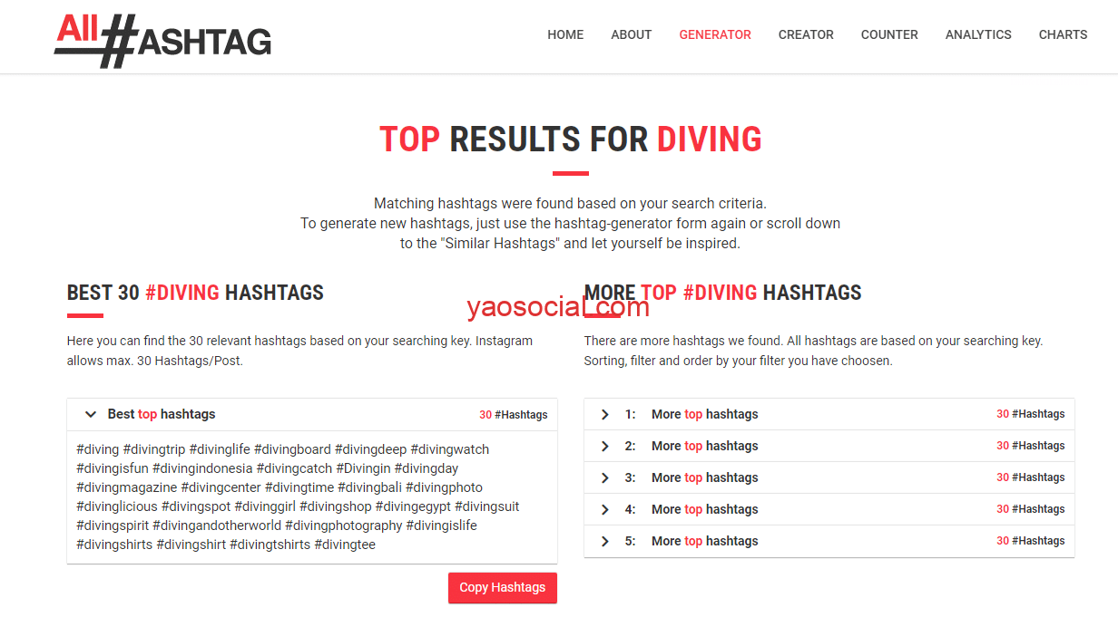 这里你就可以借助一些小工具帮你找到Instagram上的热门常用标签,比如你做的是潜水相关的产品,那么在下面这个工具中输入关键词diving,那么它就会帮你推荐出来和diving相关的top hashtag