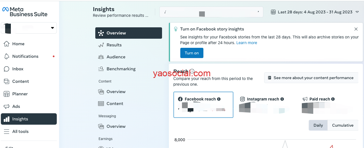 Insight:数据洞察, 展示来自Instagram,Facebook的粉丝数据分析,比如触达数、粉丝性别和分布等等