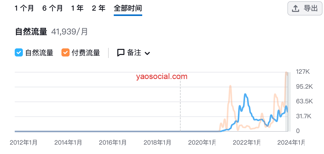 通过2021年的砸钱,网站的关键词在只有1000多个词的情况,2022年自然流量居然还达到了峰值。