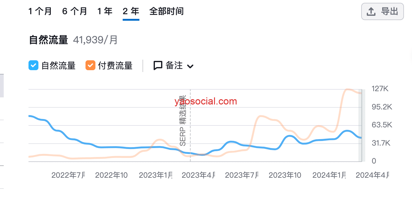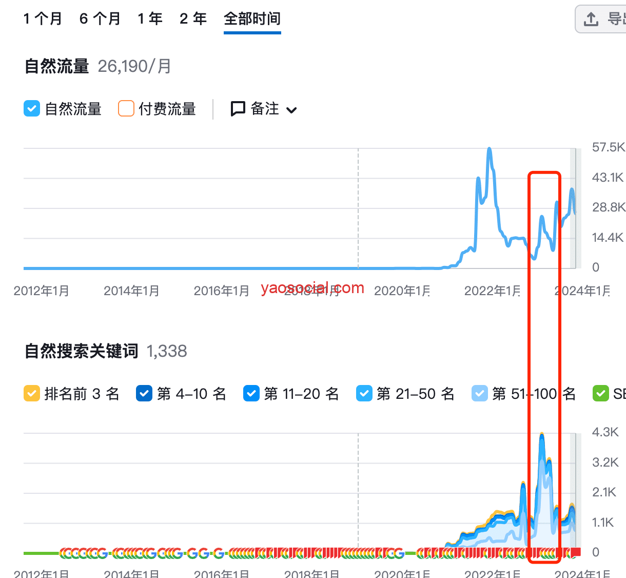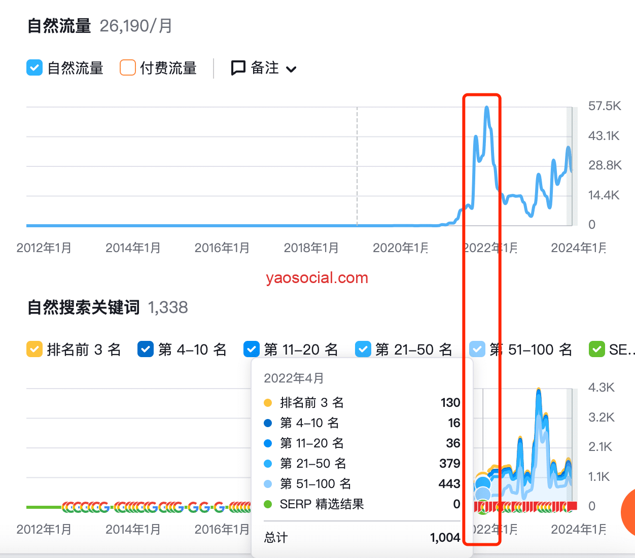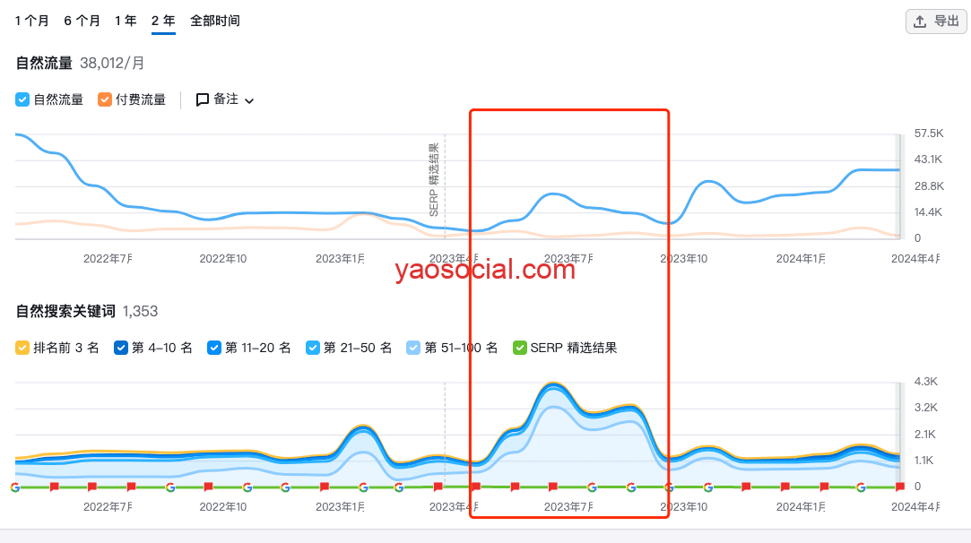 而在2023年通过和大媒体的PR合作,又再次反哺了网站的关键词数量和自然流量的增长。见下面的这张图,在同一时间段关键词数量和自然流量的变化。