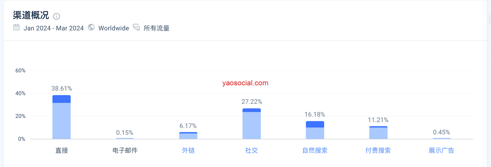 直接流量38.61%,网红,PR合作和品牌词的SEO其实最终都会部分转换成直接流量,再加上产品本身也存在耗材,老用户和转介绍也会贡献一部分的直接访问流量。