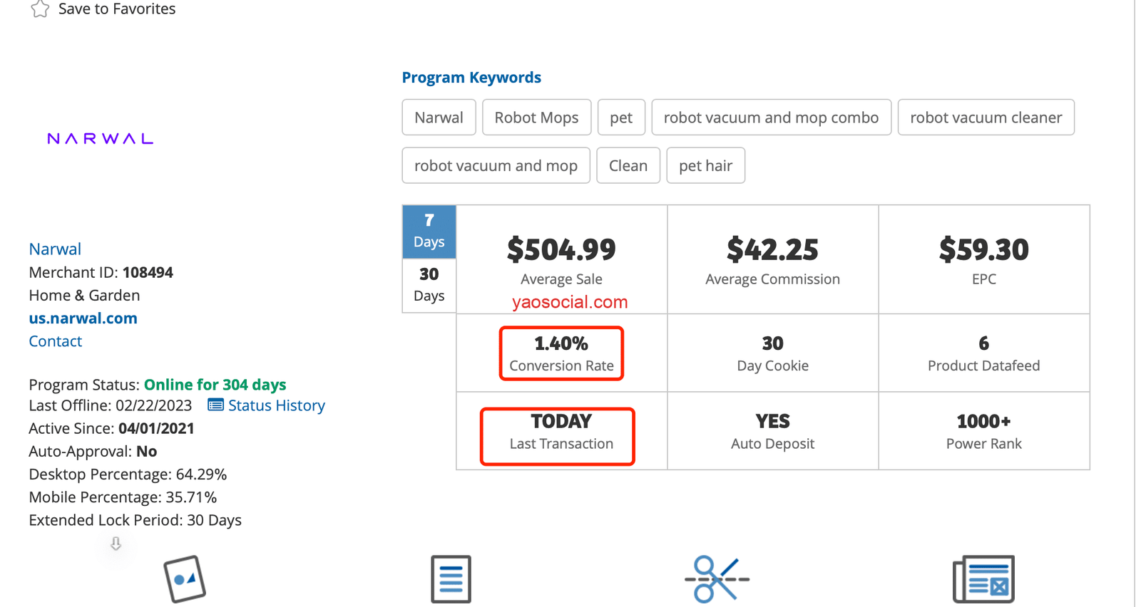 而在referred方面,PR贡献了一部分,估计联盟这边贡献也不少。虽然narwal入驻shareasale还不到一年,但是从shareasale的商家数据来看,网站转化的转化率至少1.4%。 请注意,这里的转化率数据一定是低估了的,因为联盟客的流量比较庞杂,所以转化率数据一般会低于网站的真实转化率。