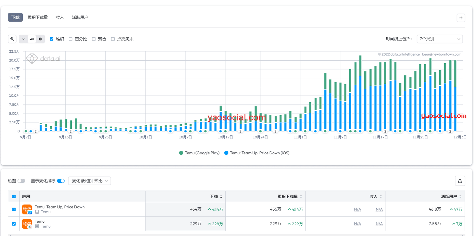 因为美国市场是有同时使用APP和PC网购的习惯,temu APP的推广也于9月1日启动。从APP第三方数据平台Data.ai的的统计来看,截止到2022年12月2日,安卓的下载量有455万次,IOS端的下载有229万,双端加起来每日的活跃用户差不多54万人次。