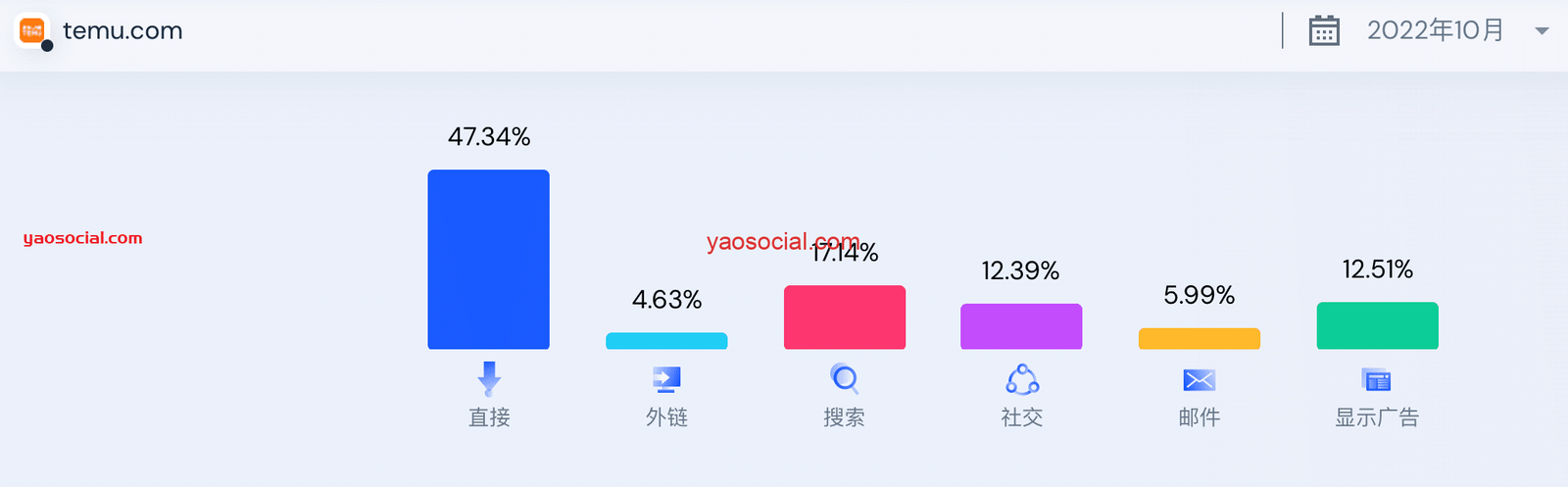 我们从simialrweb上可以看到Temu的社交流量占到了12.39%