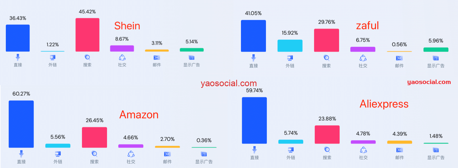 千万别小看这12.39,要知道大部分网站的社交媒体流量也就5%左右, 亚马逊也才4.66%,shein 8.67%,zaful 6.75,速卖通 4.78%。 从这里可以看出目前他们的社交媒体广告(Facebook和YouTube)投放力度十分惊人