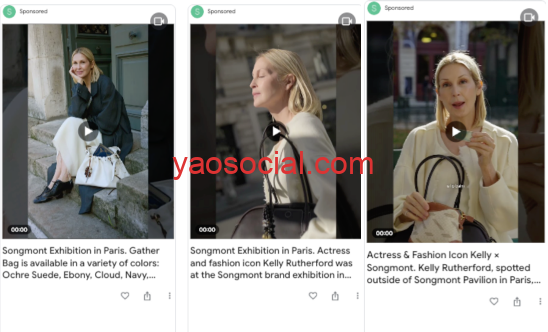 同样,在箱包品牌Songmont近期广告中,你会发现他们有段时间内使用了美国明星老钱风的代表Kelly Rutherford的产品推荐,这也是对原则四的使用。(但是北美过气明星带货效果一般,